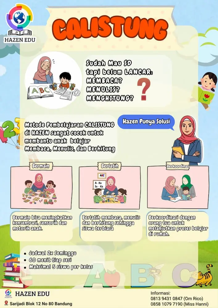 Mempersiapkan si kecil untuk jenjang sekolah dasar? Program CALISTUNG kami hadir untuk membantu anak Anda menguasai kemampuan dasar membaca, menulis, dan berhitung dengan cara yang menyenangkan dan tidak membosankan!