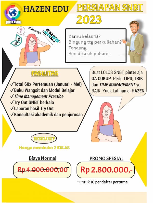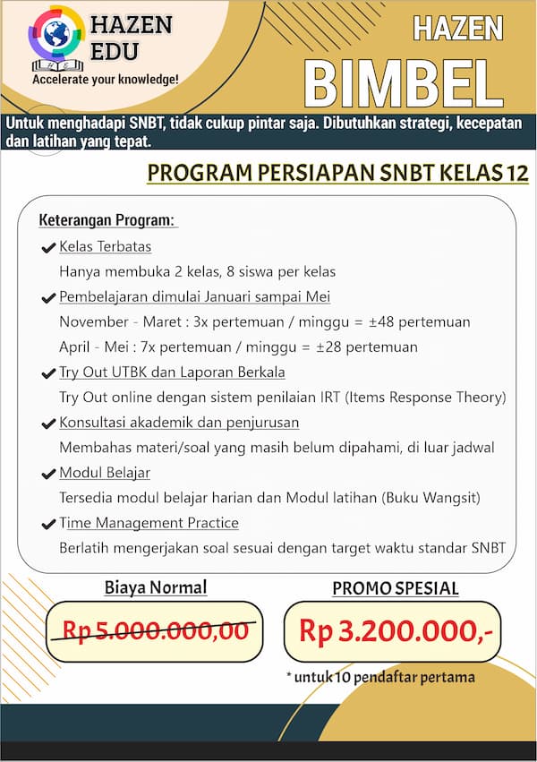 Mimpimu masuk Perguruan Tinggi Negeri (PTN) kini di genggaman! Program Persiapan SNBT Hazen hadir untuk membimbingmu menuju sukses UTBK dengan cara yang efektif, terstruktur, dan paling penting, biaya yang sangat terjangkau!